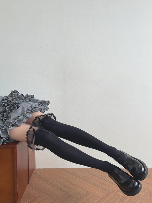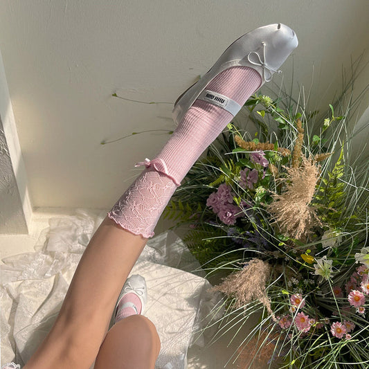Hua Nai Cat - Sweet Cotton Lolita Socks Mid-Calf Socks with Lace and Bow