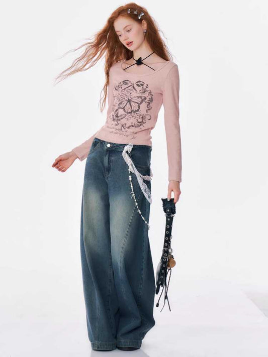 loose straight washed blue jeans
