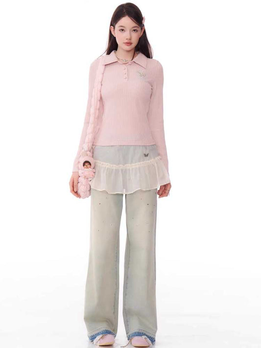straight wide-leg washed diamond jeans