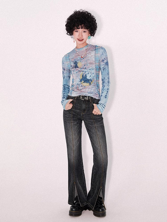 Printed Straight Leg Flare Jeans