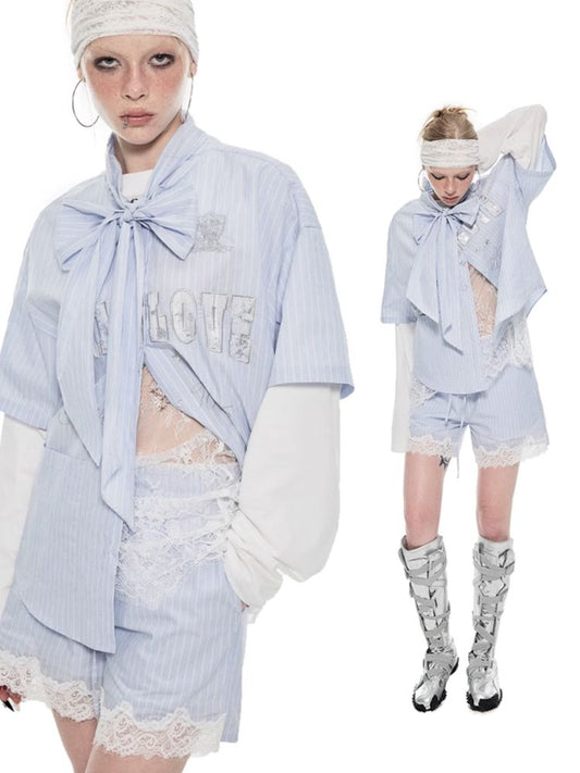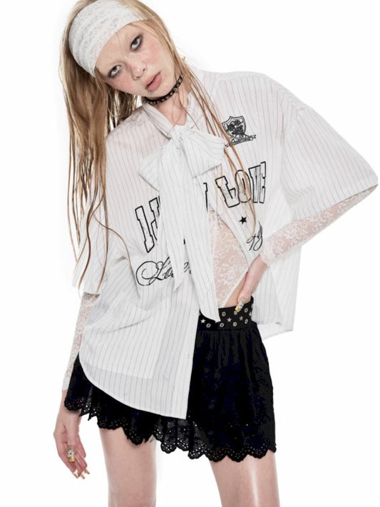 Striped Bow Tie Puff Sleeve Dress Shirt