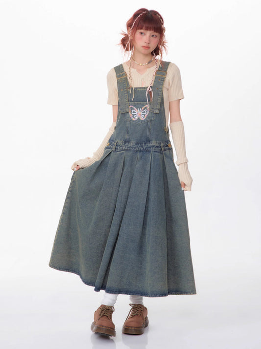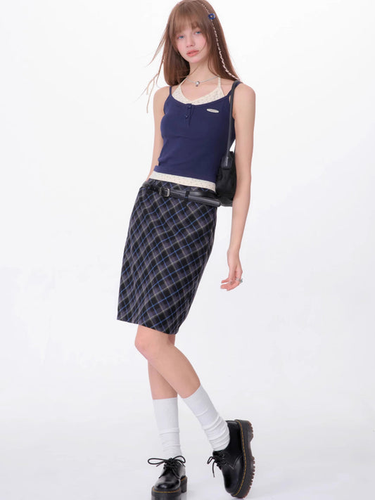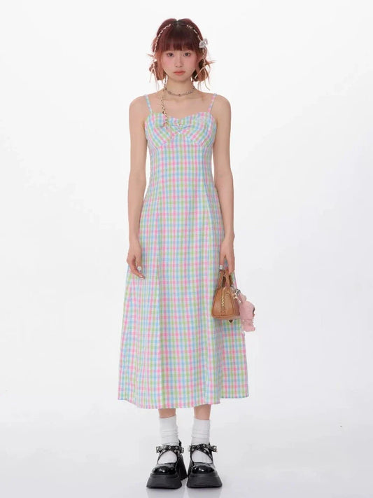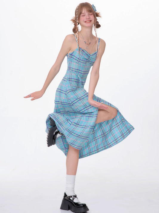 Sold outVendor:ziziFeiblue slit suspender plaid dress