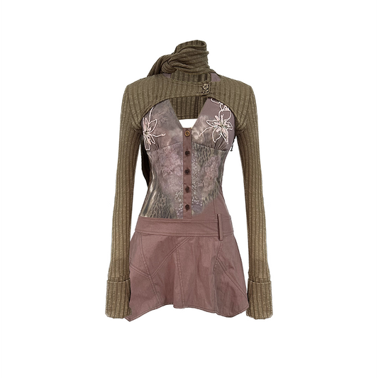embroidered beaded dress with knitted waistcoat and scarf