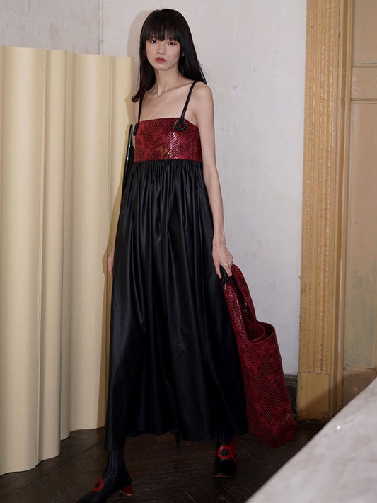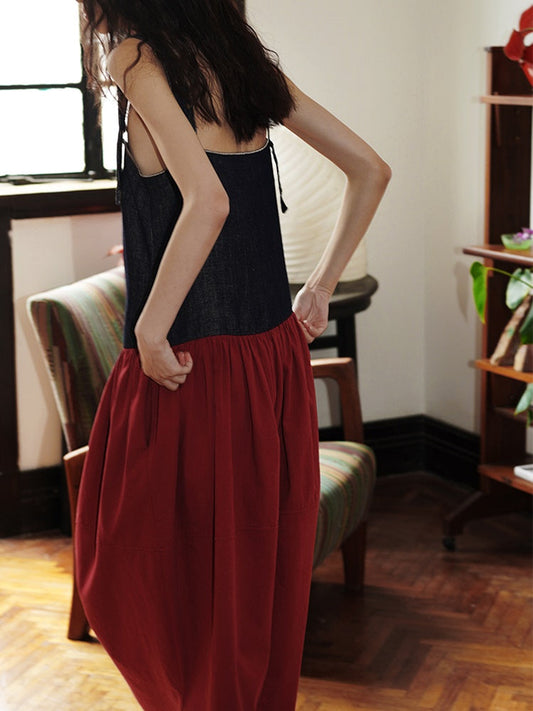 Sold outVendor:badtasteEmbroidered Denim Panel Strap Dress