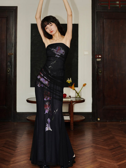 Hanfu-Style Slim Printed Mesh Strapless Dress