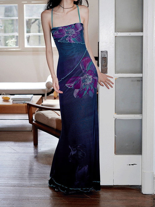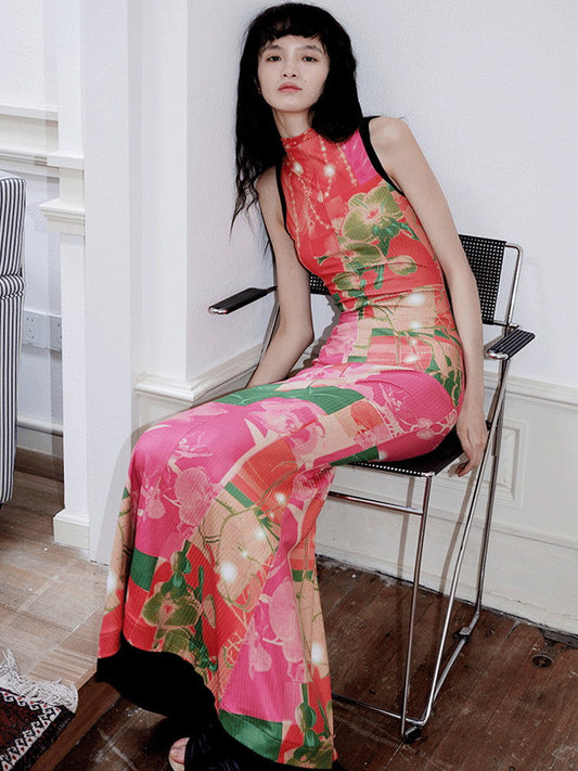 Backless High-Neck Sleeveless Floral Patchwork Dress