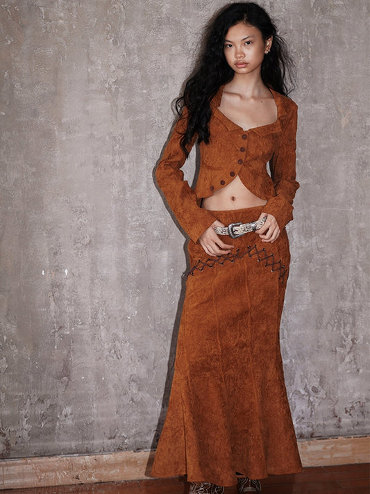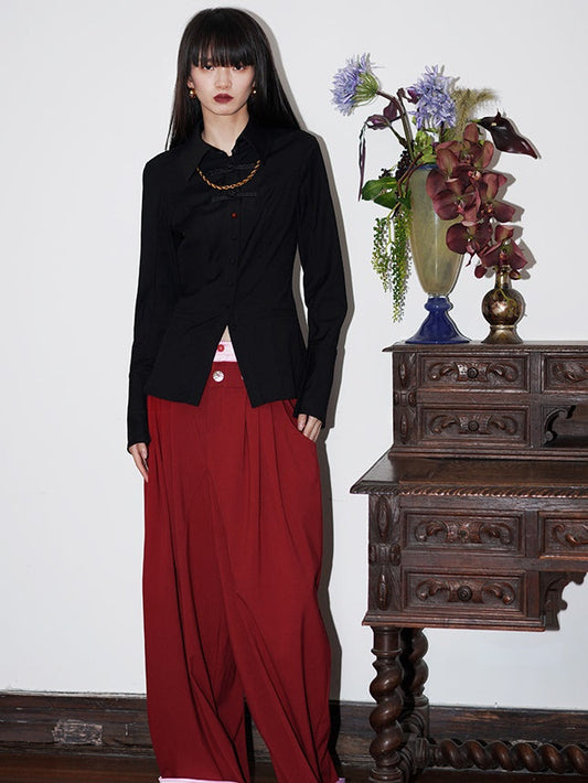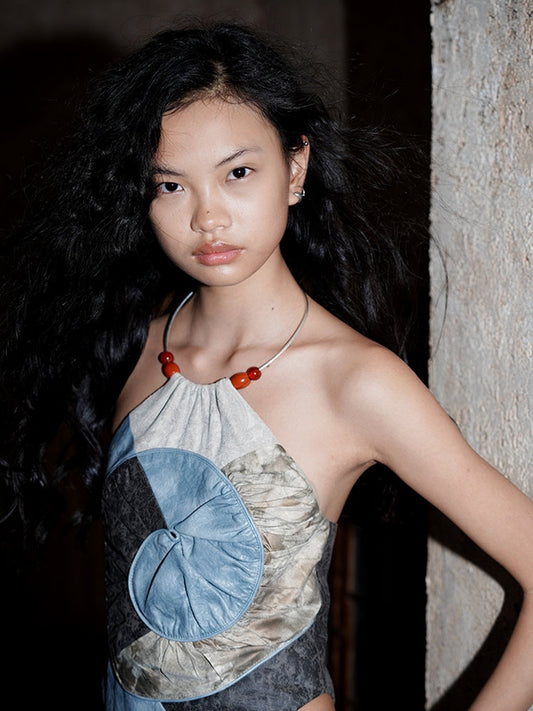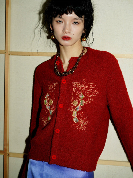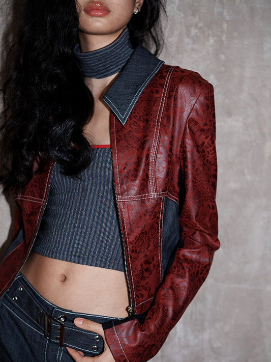Embroidered Floral Knit Top with Faux Leather Wrap Collar