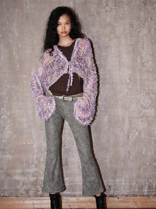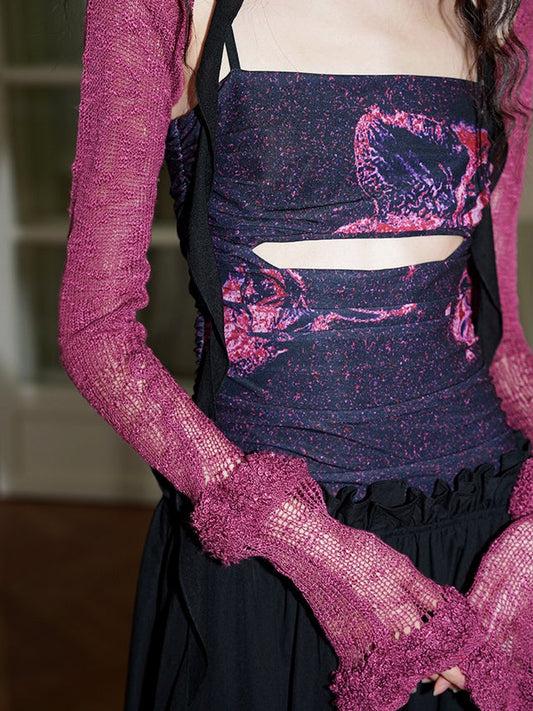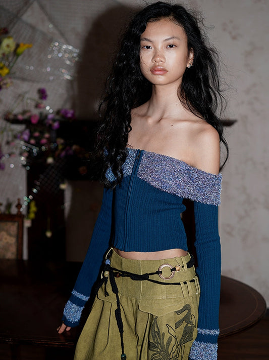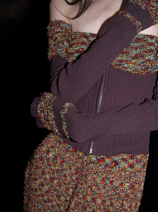 Colorful Zip-Up Off-Shoulder Knit Top with Arm Covers