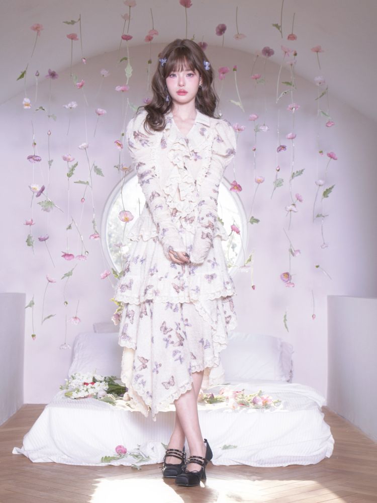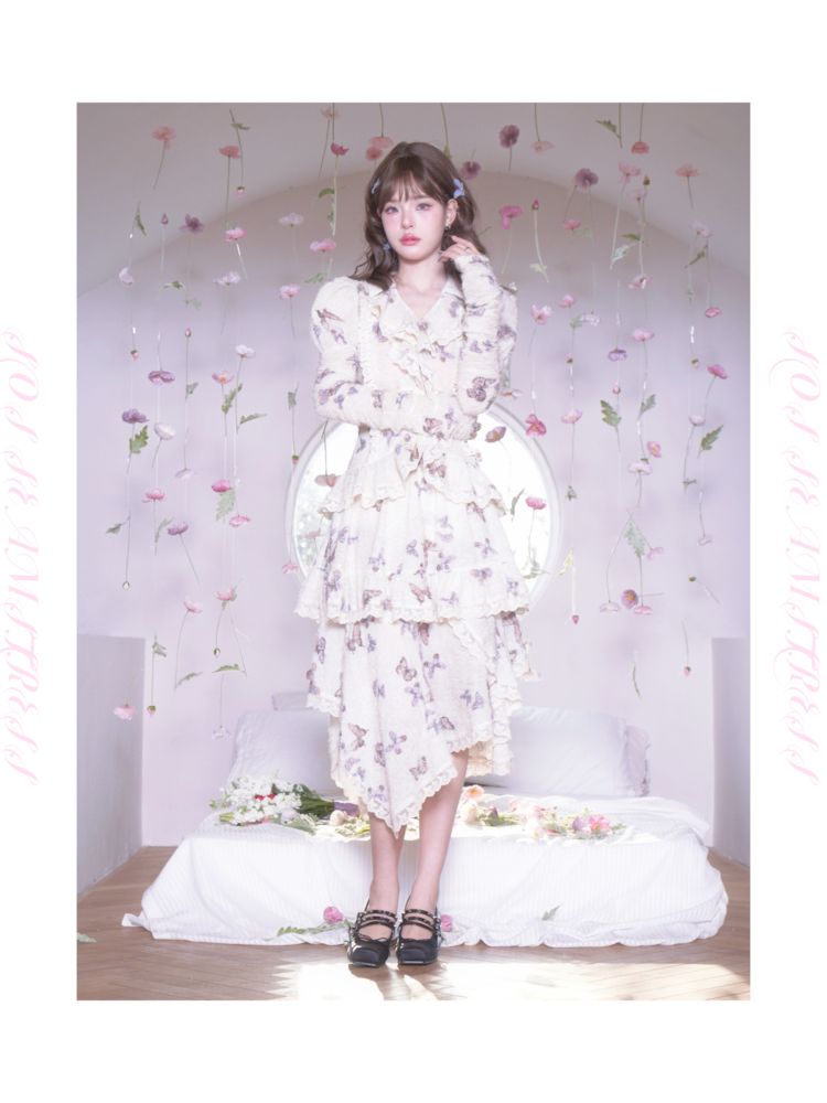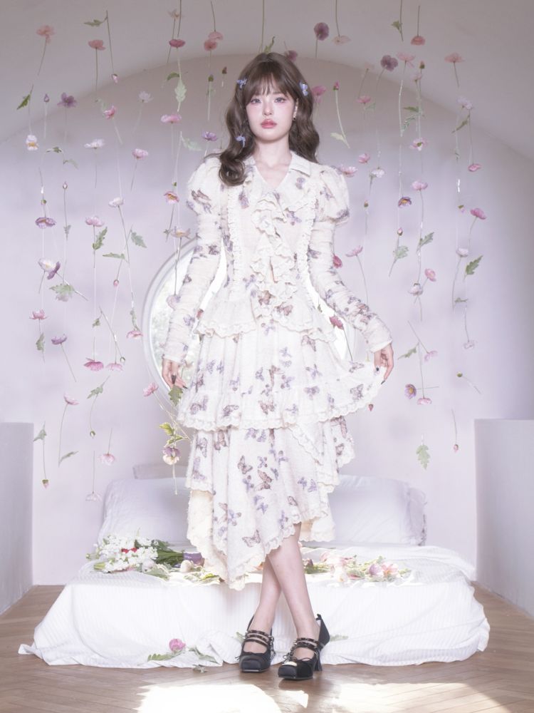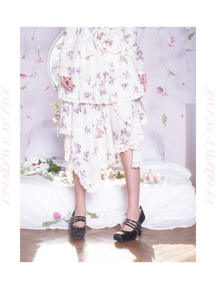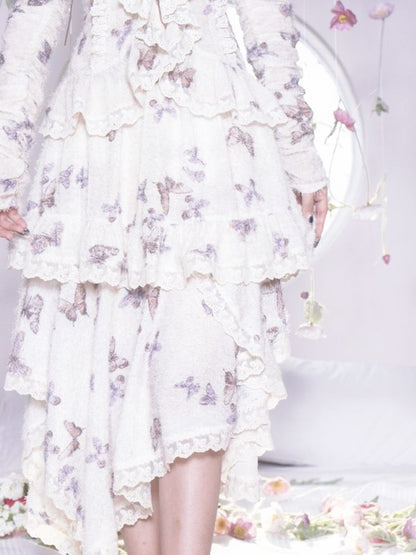 butterfly print irregular hem lace ruffle skirt