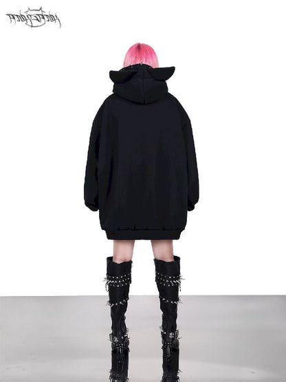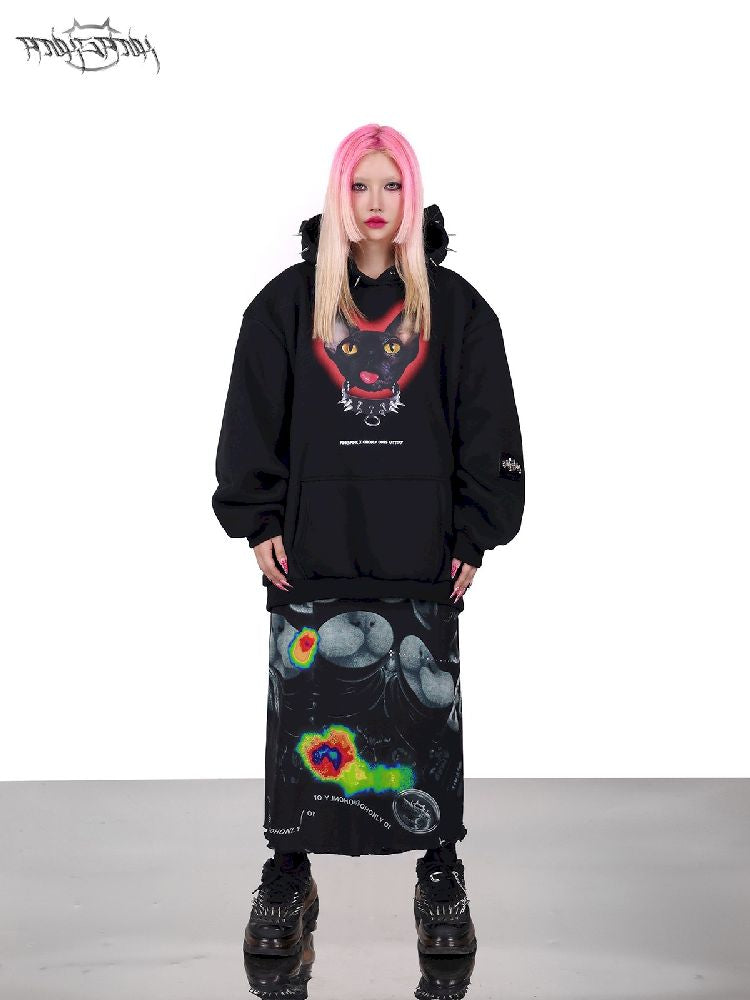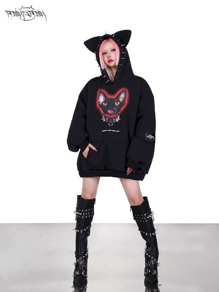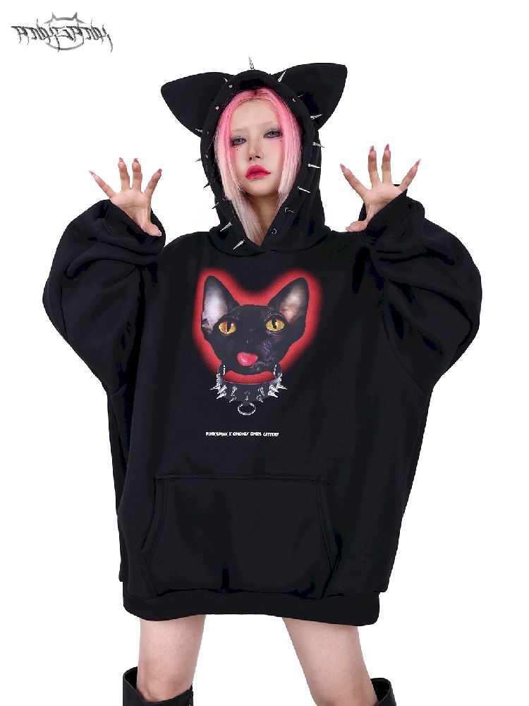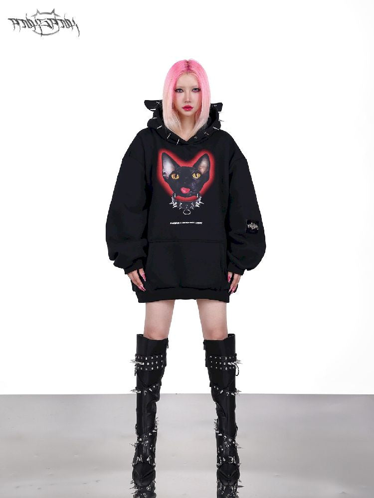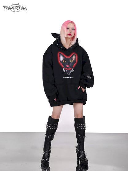 Hairless Cat Print Ears Hooded Rock Punk Sweatshirt