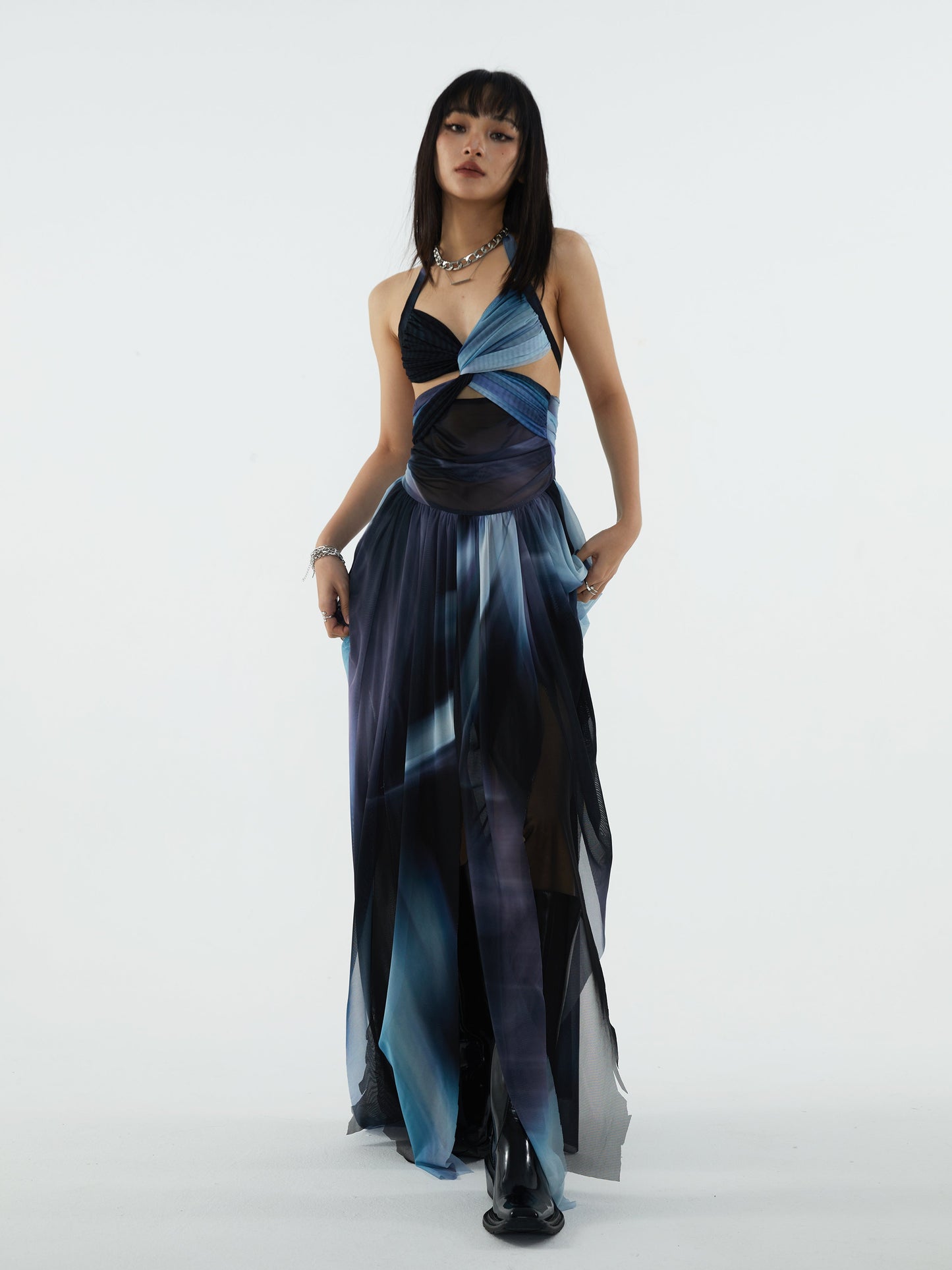 夜の水面を閉じ込めたようなインディゴのグラデーションが際立つロングドレス。