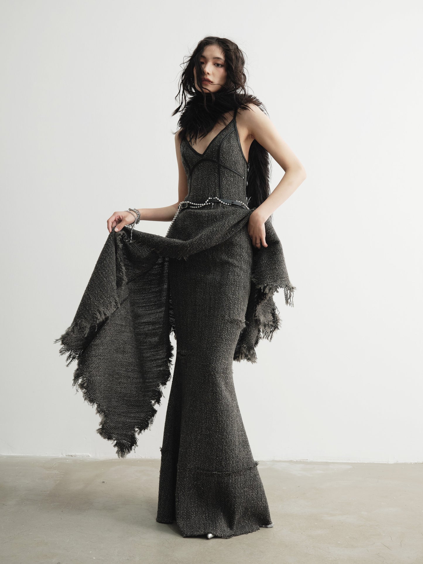 深いVネックがデコルテを美しく見せ、しなやかなマーメイドラインが身体の曲線を美しく縁取ります。